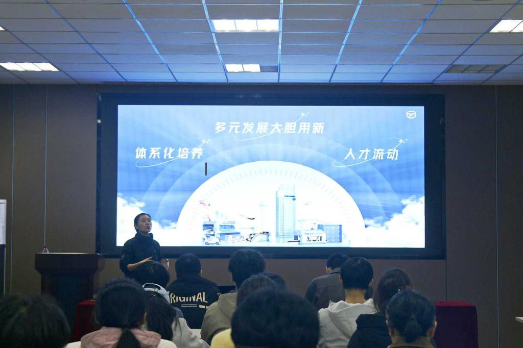 为助力毕业生精准就业,11月7日,商学院在经管楼310举办了顺丰集团专场招聘会。本次招聘会精准对接物流行业头部企业,吸引了大量毕业生到场参与。顺丰公司招聘负责人系统介绍了公司的发展前景、企业文化及管培生计划,其中“新鹰计划”因提供“毕业即上管理岗”的快速通道而备受关注。宣讲会现场气氛热烈,部分毕业生在会后直接进入面试环节,迈出求职第一步。活动结束后,学院领导与顺丰企业代表还就进一步推进产学研合作达成初步共识,为双方未来深度合作奠定良好基础。